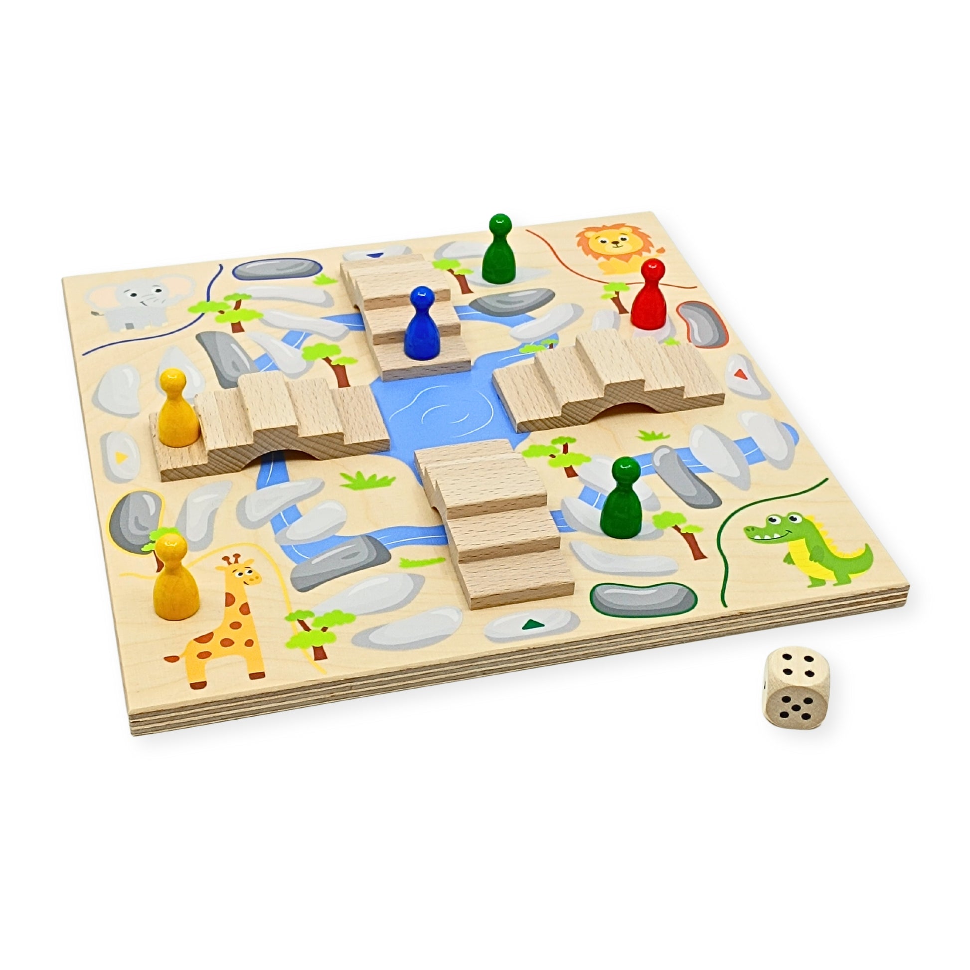 Ein tierisches Wettrennen durch die Wildnis für Kinder ab 4 Jahren. Löwe, Elefant, Giraffe und Krokodil machen sich auf den Weg zum Wasserloch. Wer bringt seine vier Tiere zuerst sicher ans Wasser?